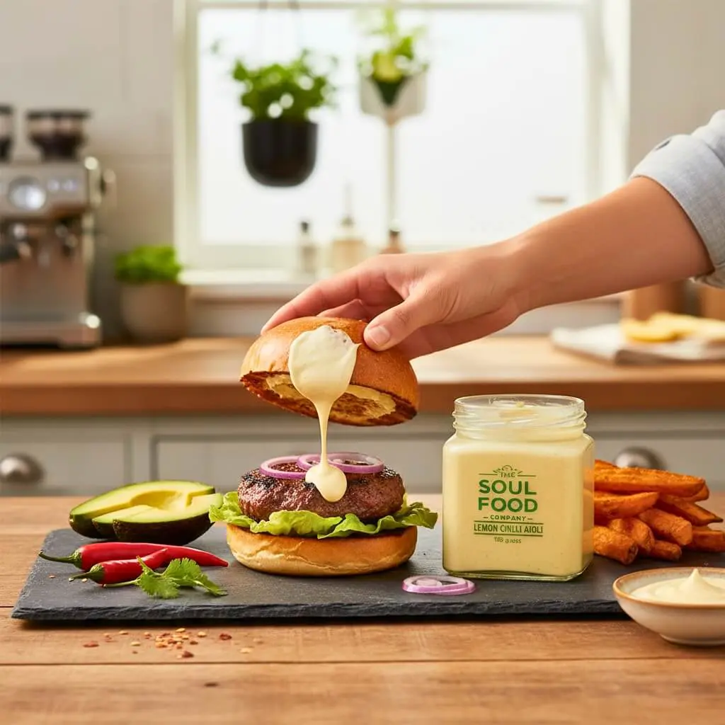 This lemon aioli blends zesty lemon juice with creamy mayonnaise and the subtle heat of Soul Food chilli oil. It’s light, smooth, and bold—perfect for anyone who loves flavor with a little personality.